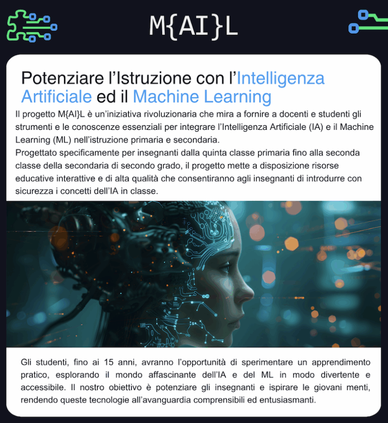 M{AI}L nasce con l’obiettivo di rendere l’IA e il ML accessibili, comprensibili e concretamente applicabili nei contesti scolastici, con particolare attenzione agli insegnanti della scuola primaria e secondaria di primo e secondo grado e agli studenti nella fascia d’età compresa tra i 10 e i 15 anni.